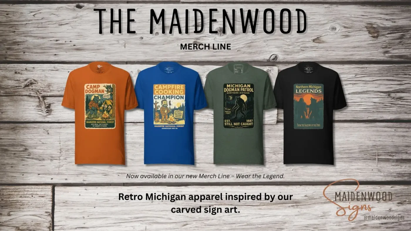 We’ve been carving signs for years—now you can wear the spirit of the Manistee National Forest with our new Michigan T-shirts. Our new Maidenwood Merch Line celebrates Michigan legends, campfire humor, and Northern pride.Each design is printed on ultra-soft Bella + Canvas cotton with retro artwork inspired by our vintage sign style. 🌲 About the […]